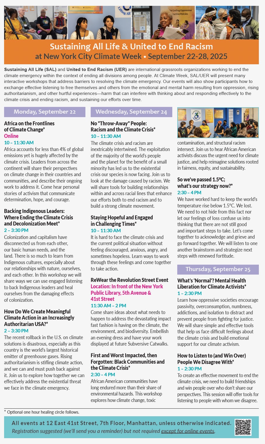 Sustaining All Life (SAL) / United to End Racism (UER) will be presenting workshops and other events at New York City Climate Week 2025 in Manhattan. Most of our events will be in-person, though we do have several online. Here's the front of our flyer (draft of full flyer here--still being updated) and a listing of our events, with links to the announcement on the Climate Week website and a registration link (registration optional except for online events--but we will send a flyer and reminder to those who register).
