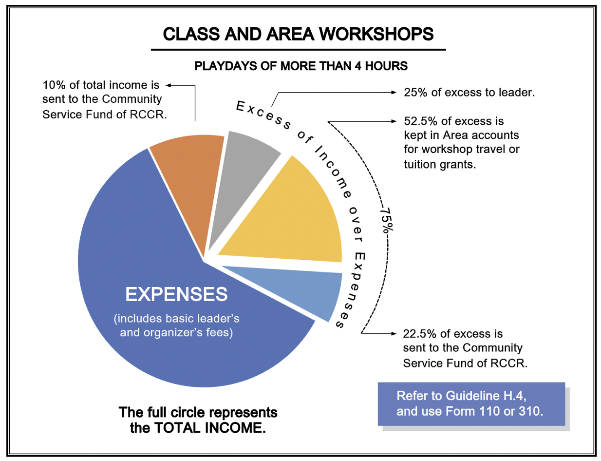 The budget for every class or Area workshop, or daylong (more than four-hour) playday, must include a payment of 10% of the total income, before deducting any other expenses, to the Community Service Fund.[108] (Organizers can estimate the total number of people who will attend the event to figure out the 10% payment and add it to the event’s budget. This payment may be increased in the final accounting, if needed.)